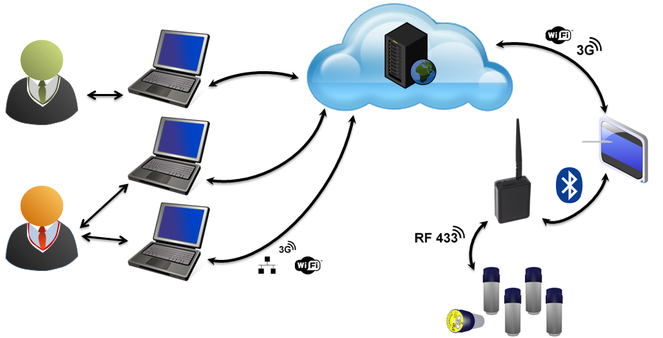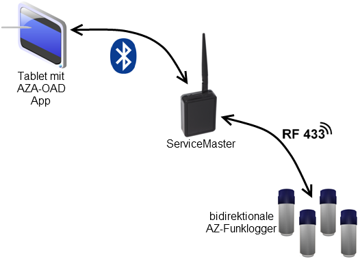 Das AZA-OAD Programm ist auf jedem gängigen Android-Tablet verwendbar, solange dieses über eine Bluetooth-Schnittstelle verfügt. Der Datenaustausch erfolgt hierbei zwischen dem AZA-OAD Programm und dem ServiceMaster über eine Bluetooth-Verbindung und zwischen dem ServiceMaster und dem Funklogger über eine Funkverbindung im 433Mhz Band.